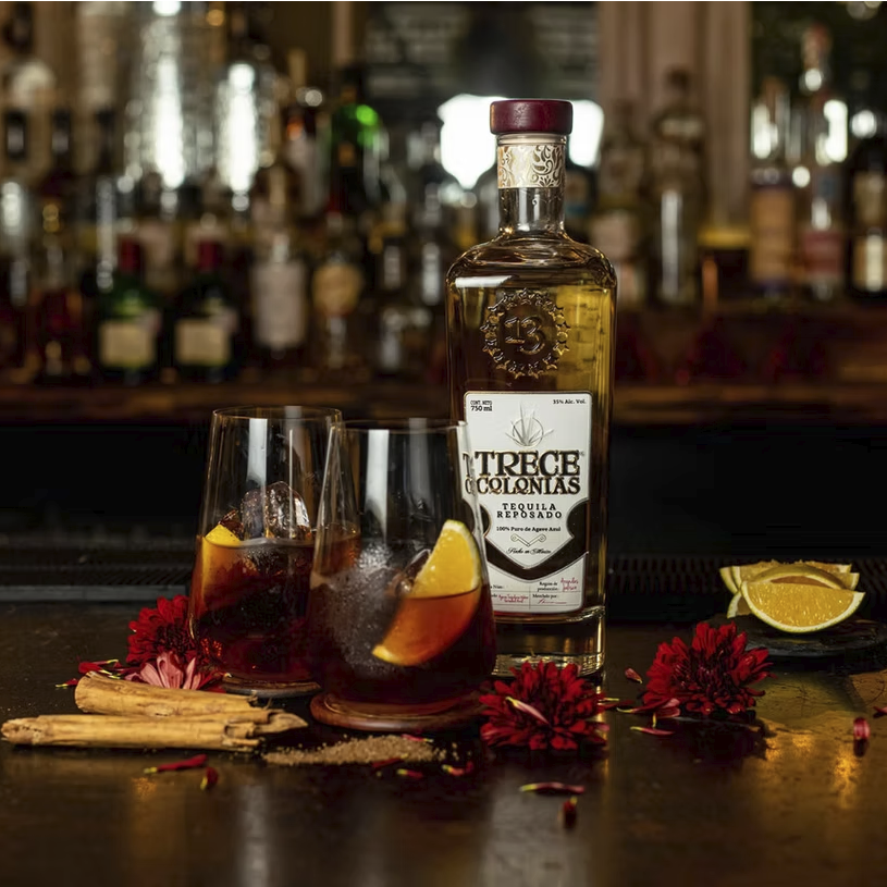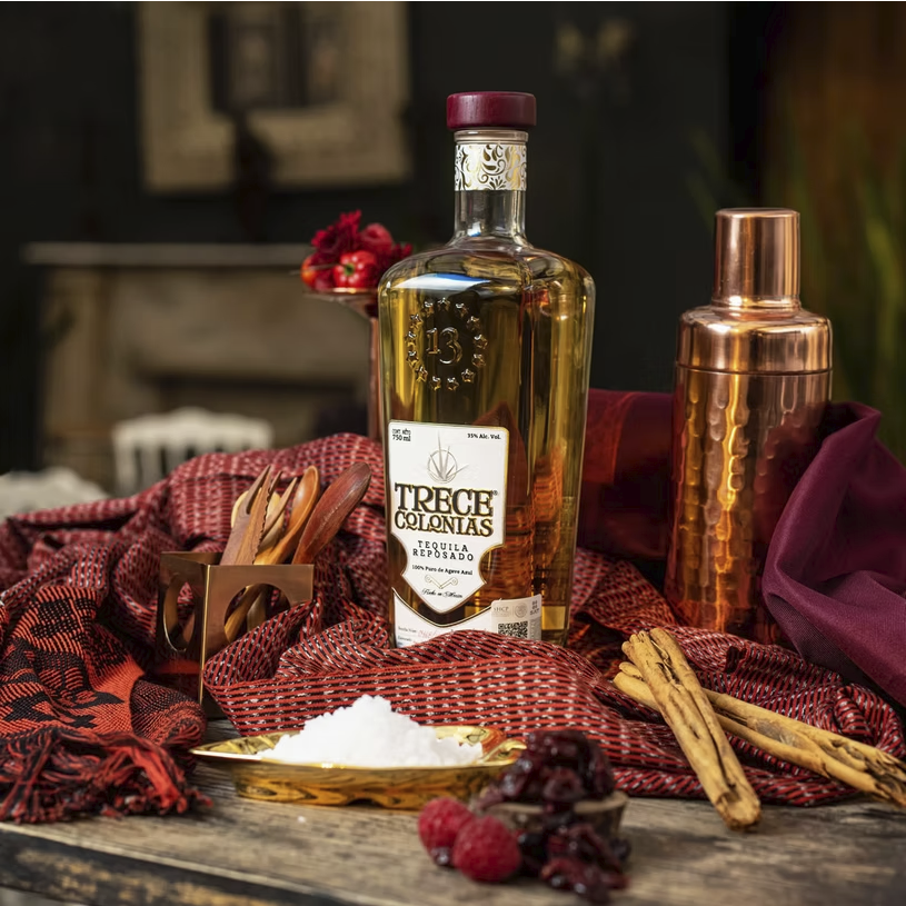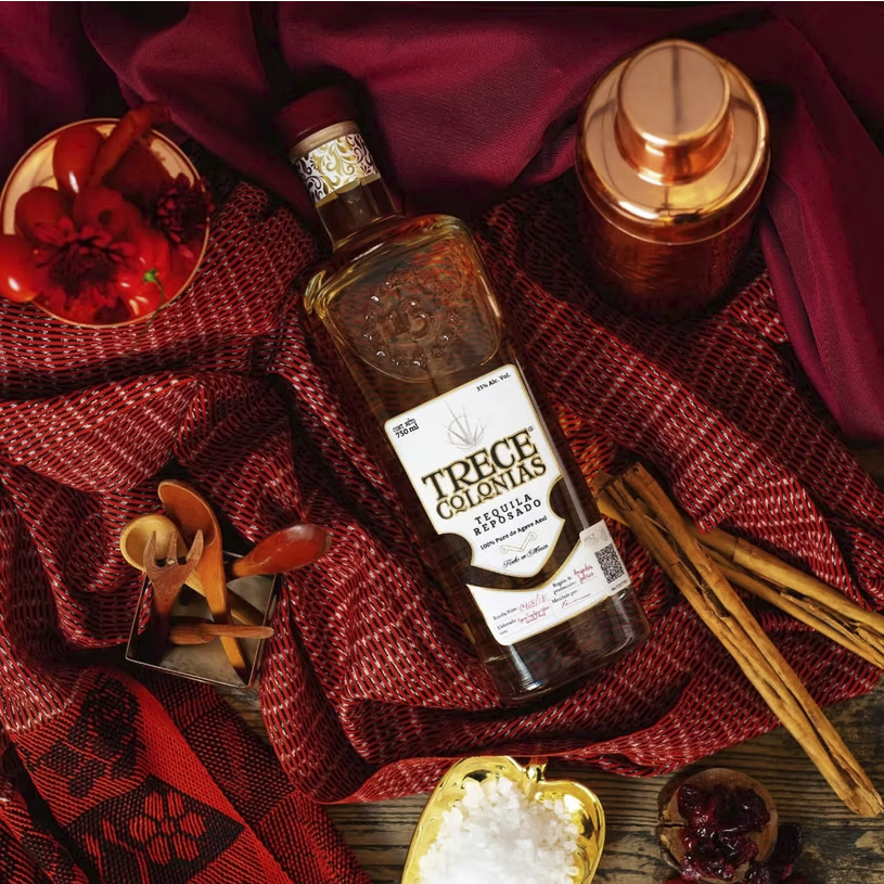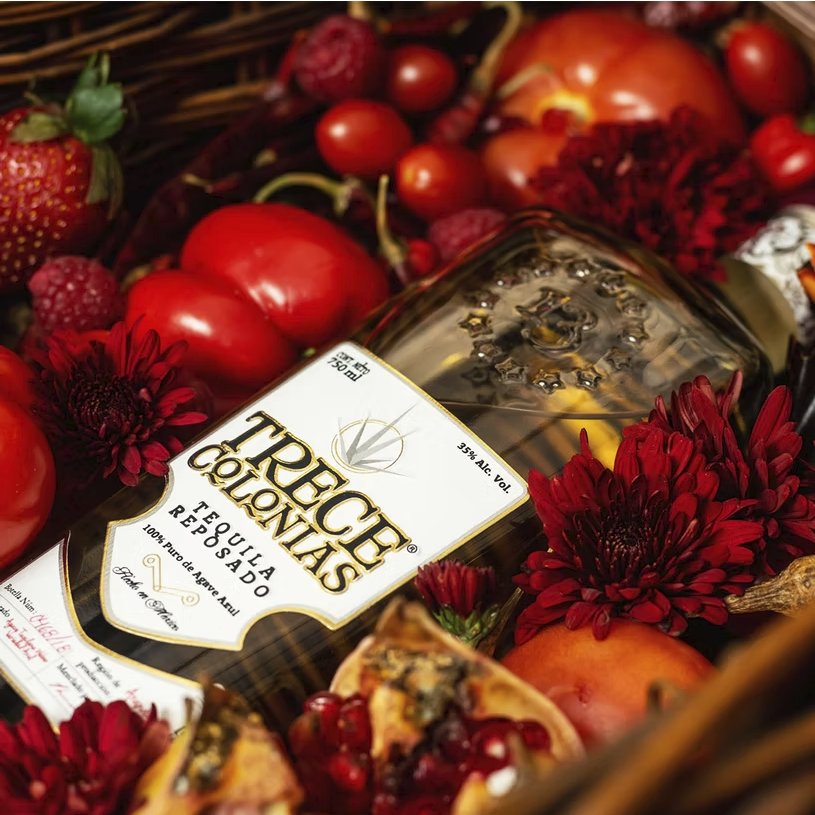 Trece Colonias es un tequila noble, reposado, 100% agave, de color ámbar natural y sabor exquisito. El equilibrio perfecto entre el agave y la madera de roble americano donde se almacena por un período de ocho meses, para mostrar una personalidad suave con notas de vainilla, madera, pera dulce y manzana.
